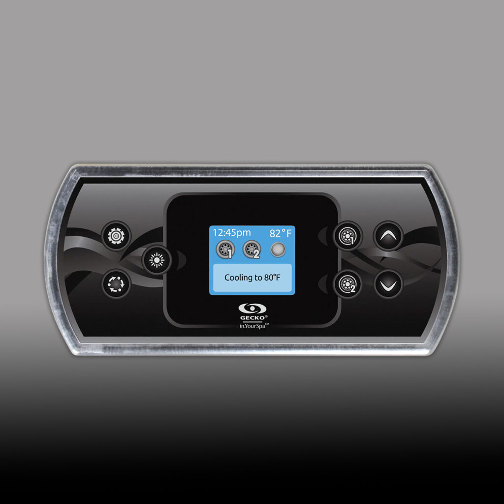 Det unikke ved AURA er den sømløse integration. Både saltsystemet og varmepumpen styres direkte fra spaens digitale Gecko in.k500-panel. Du slipper for eksterne fjernbetjeninger – alt er samlet ét sted for en ægte „high-end‟ brugeroplevelse.