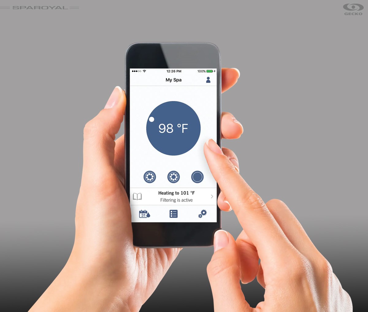 Total kontrol i dine hænder uanset hvor du er. Den strømlinede in.touch 2-applikation til iOS eller Android gør det nemt at styre og programmere dit spabads funktioner og features fra en hvilken som helst smartphone eller tablet, selv når du er væk hjemmefra. Push-notifikationer giver altid status for spabadet, selv når appen ikke er åben.